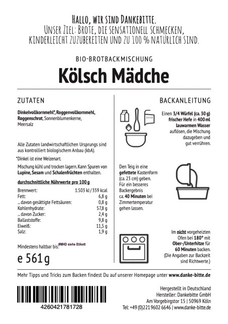 Die STARTbox enthält eine Dankebitte Brotbackmischung, eine Brotbackform, ein Päckchen Trockenhefe (nicht bei Paleo) und den Dankebitte Teigschaber! Alles, damit Du sofort loslegen kannst, Dein erstes Brot selbst zu backen. Ideal geeignet auch als Geschenk! Details: 1x BrotbackmischungJe nach von Dir gewählter Variante enthält die STARTbox ein anderes Brot... klassisch: Brotbackmischung "Dinkelkürbis"fruchtig: Brotbackmischung "Rogg die Beere"würzig: Brotbackmischung "Grüne Schnitte"nussig: Brotbackmischung "Zwibbel de Nut"Gemüse: Brotbackmischung "K3"glutenfrei: Brotbackmischung "Endl-ICH glutenfrei"Paleo: Brotbackmischung "Null Hoch Sieben"Eiweiß: Brotbackmischung " Eiweißbrot Aragorn" 1x Brotbackform für Brotbackmischung Spülmaschinengeeignet. Hochwertig antihaftbeschichtet. Dicker Stahl. Gleichmäßige Hitzeverteilung. Für eine längere Haltbarkeit der Beschichtung empfehlen wir, den Boden der Brotbackform trotz der Beschichtung leicht einzufetten, das macht das Herauslösen einfach leichter und sie nach dem Backen nur mit einem feuchten Tuch auszuwischen. Das reicht in der Regel völlig aus. Die Größe ist perfekt für eine Dankbitte Brotbackmischung. Größe: 23x13cm. Höhe 6,5cm. 1x Dankebitte Teigschaber 1x Trockenhefe (nicht bei der Variante Wunderbrot und Paleo) 1 Päckchen Trockenhefe a 7 Gramm aus 100% getrockneter Frischhefe - sonst nichts.Reicht für eine Dankebitte Brotbackmischung. Dekoration nicht im Lieferumfang enthalten. Diese Brotbackmischung ist nach Abfüllung ungeöffnet mindestens 9 Monate haltbar! 100% Natur!