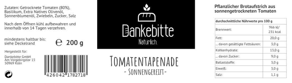 Die Dankebitte Tomatenpaste im 200 g Glas besteht aus sonnengereiften Tomaten, Olivenöl und ist mit etwas Salz und Gewürzen abgeschmeckt. Frisches Brot in diese Creme getunkt, ist ein echter Genuss. Schmeckt mild und unaufdringlich, dennoch kräftig. Passt perfekt zu gutem Brot, etwas Frischkäse und Rotwein. Feinste sonnengereifte Tomaten, handverlesen, mit nativem Olivenöl und mediterranen Kräutern- ohne Konservierungsstoffe!Hallo Du Genussmensch! Hast Du schon unsere Tomatentapenade entdeckt? Nein? Na dann wird es aber höchste Zeit! Denn diese Tomatenpaste bringt die Sonne in Dein Leben – und auf Dein Brot!