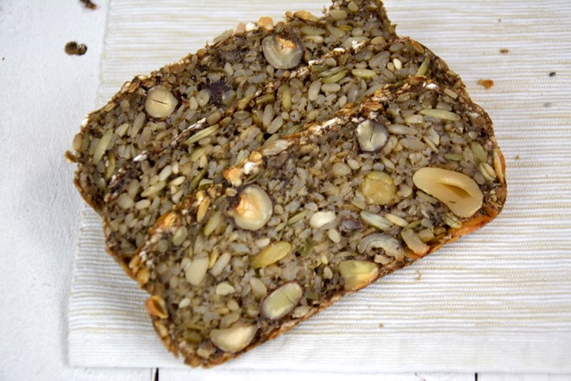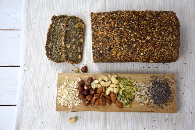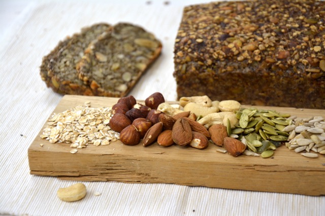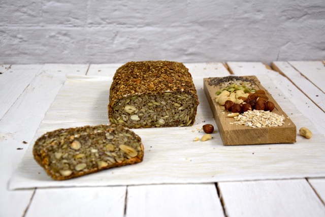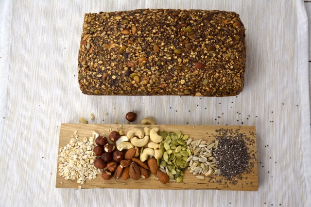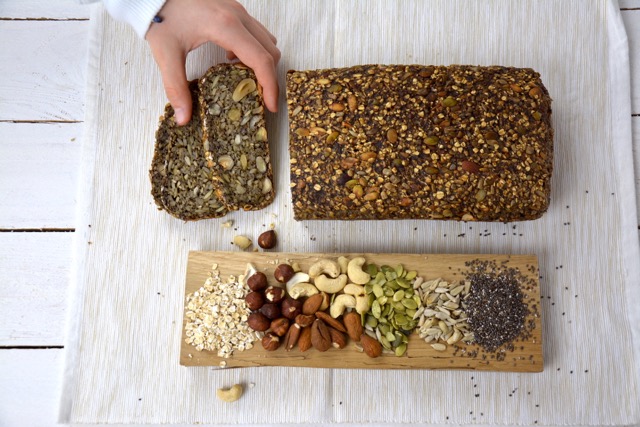 Das Haferflockenbrot besteht aus glutenfreien Flocken, jeder Menge Saaten und eben auch ordentlich vielen Nüssen.
