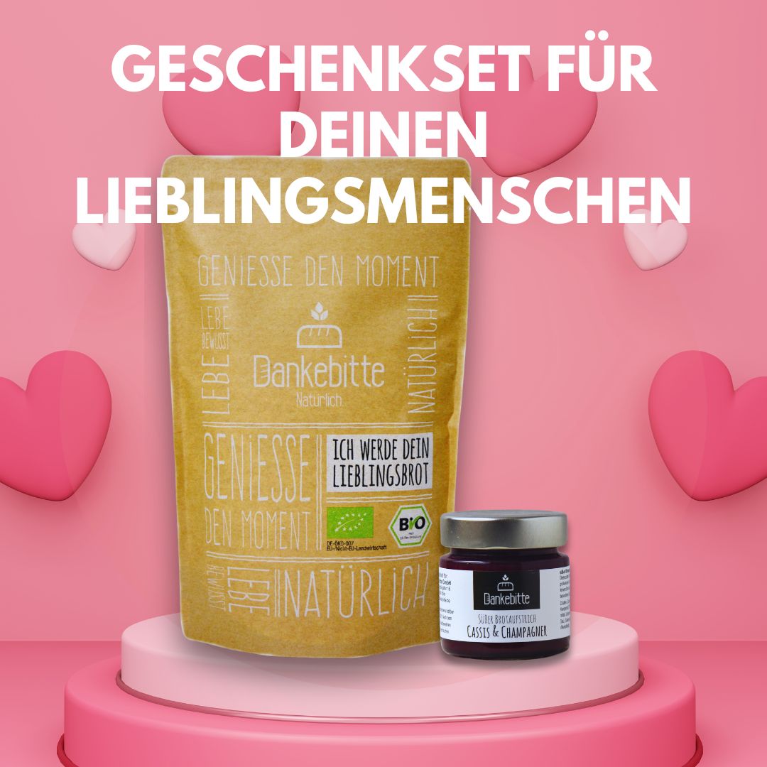 Das Dankebitte-Brot "Weisse Bescheid Schätzelein", den leckeren Dankebitte Fruchtaufstrich Aprikose-Orange, gaaaaanz viel Liebe und ein Päckchen Trockenhefe.